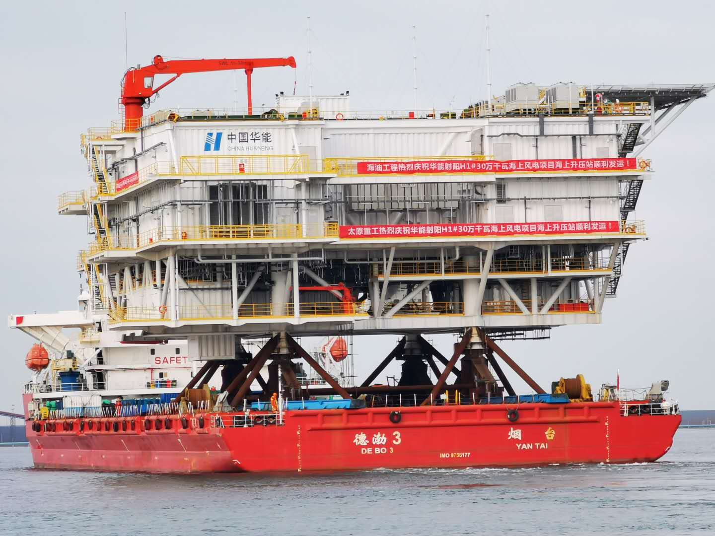 据悉,此次 30 万千瓦海上风电升压站项目,位于射阳港区东南侧海域,整体为钢结构焊接形式。主要由上部组块、导管架、钢管桩组成,总重量约 5800 吨。海上升压站被誉为海上风力发电厂的“心脏”,所有风力发电机发出的电能均在此汇集,经海上升压站后由海缆接至陆上集控中心。